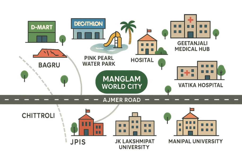 Manglam World City is strategically located in one of Jaipur’s fastest-growing areas. Its position along Ajmer Road makes it highly accessible and well-connected to important landmarks.